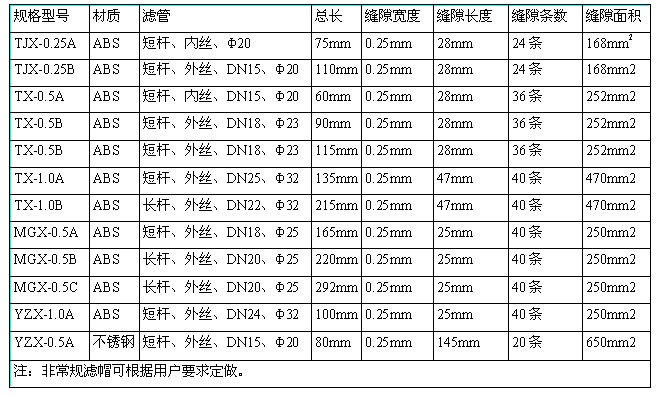滤头排水帽:本公司供应的滤头材质采用ABS工程塑料及不锈钢材料供应。表面光滑,无毛刺,承压强度高, 踩碰不碎,在滤头结构中采用强化螺纹,增设橡胶垫圈,联接牢固,不脱落。滤头帽底座设计增强底缝,使与滤板间无死水区,不积泥等优点。滤头按形状可分为:蘑菇形、圆拄形、塔形等几种,使用中可根据不同的设计要求及滤头的工作环境,采用不同结构的滤头(如:长柄、短柄,按流量可分为:流量:1吨、0.5吨、0.25吨),长柄滤头应用于滤池气水反冲洗配水系统;短柄滤头应用于滤池单水反冲洗和重力式、压力式滤罐及离子交换滤床等配水过滤系统。